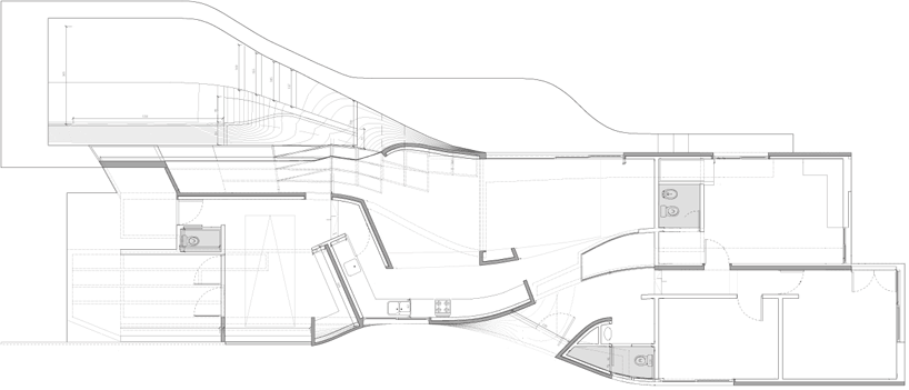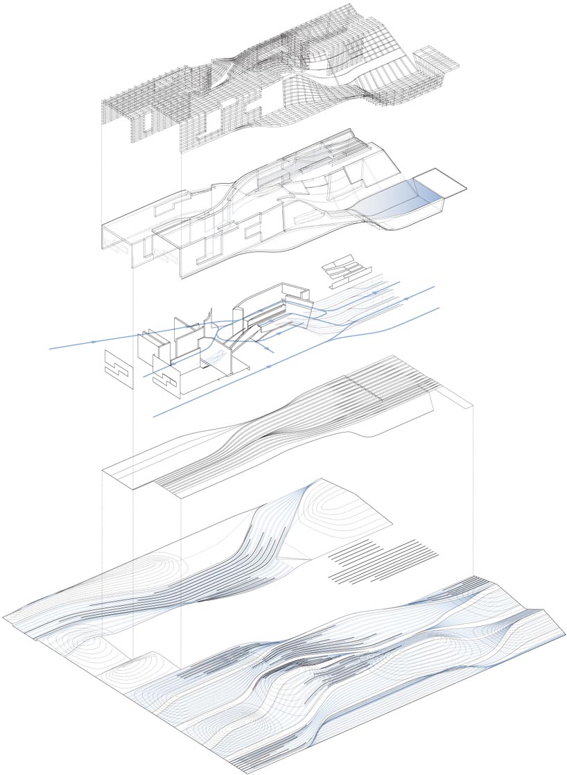 through a number of folds and bends, the cast-on-site reinforced concrete shell forms