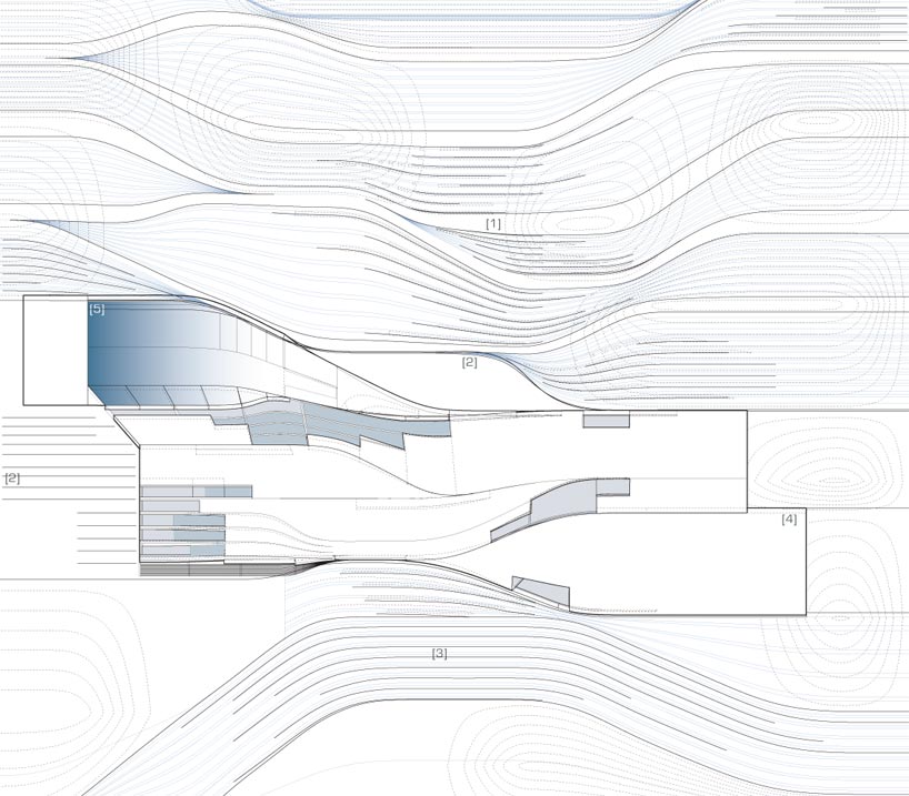the landscape beyond. the projecting roof near the pool area is broken down into a number